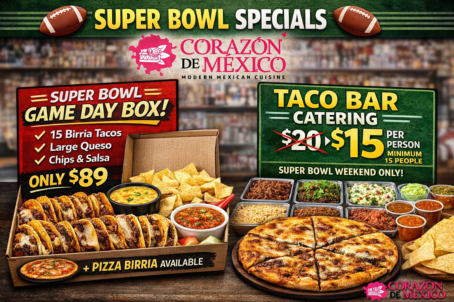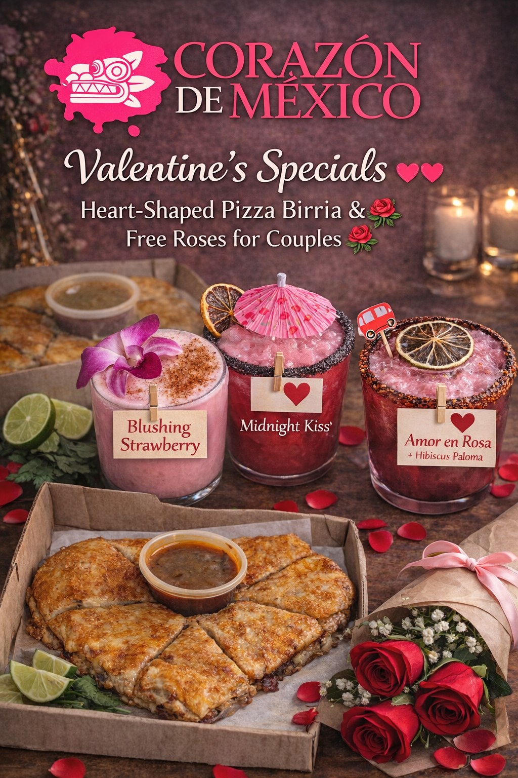 Corazón de México is best known for our birria. From birria tacos and quesabirria to our signature birria pizza and birria ramen, our slow-cooked, flavorful beef has become a local favorite. We’re also known for generous portions, bold flavors, and a welcoming, family-style atmosphere.